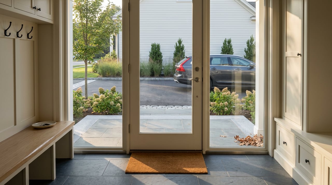 - Decor: Planters have fresh flowers, and the doormat is clean and inviting.